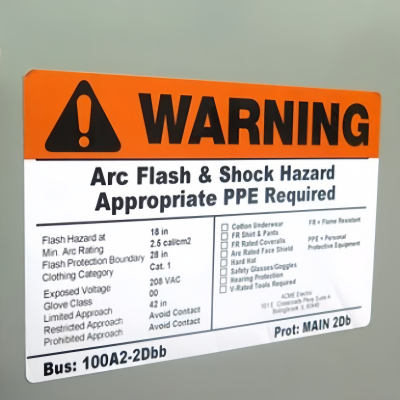 5. Electrical switchgear: Various labels, nameplates, and warning labels for enclosures.