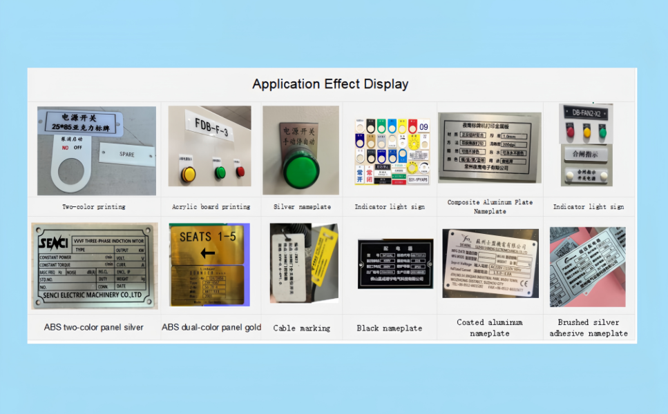 | It can produce various types of printed signs on materials, including PVC boards, PET boards, gold and silver boards, acrylic boards, ABS two-color boards, composite aluminum boards, coated aluminum boards, copperplate paper certificates, shrinkable tubes, continuous labels, die-cut labels, reflective signs, pipeline signs, valve labels, and more. |
